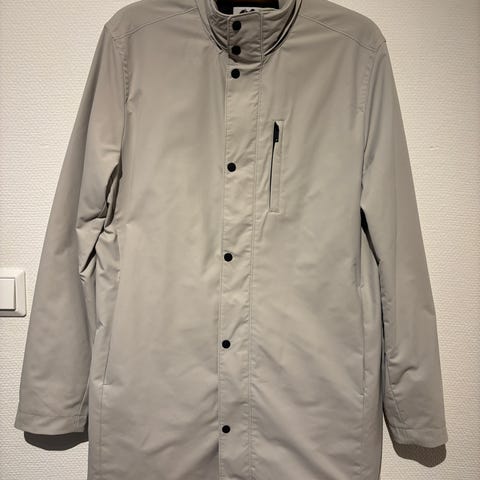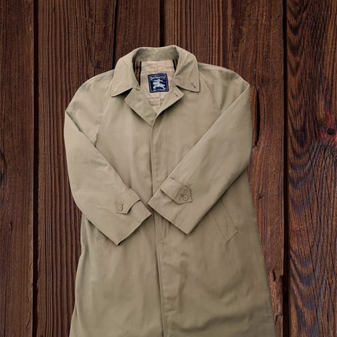 Burberry rockar herrrock i storlek L. Färg beige och tillverkad i bomull. Lång modell med hög krage och avtagbart halsbandsspänne. Knappar framtill med dold knäppning. Bälte i midjan och remmar vid ärmslut för justering. Rutigt foder på insidan. Passar som ytterplagg för herr.