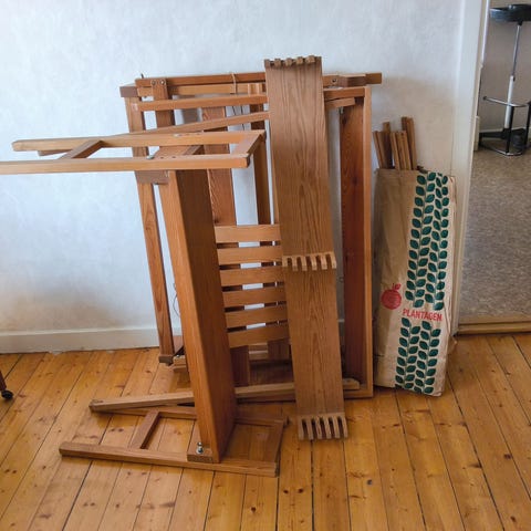 Vävstolen är varsamt använd, och är idag nedmonterad. Den är komplett med alla delar inkl monteringsanvisning. Diverse tillbehör som skedar, solv och garner mm ingår. Bortskänkes mot avhämtning.