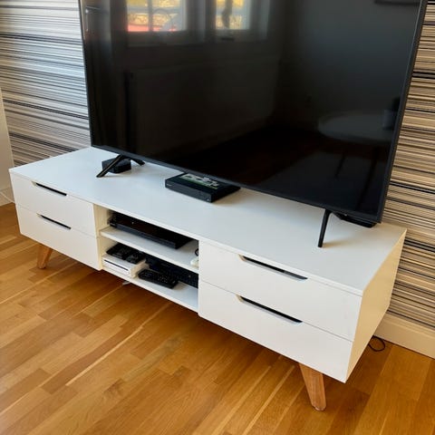 Fint vitrinskåp med glasdörrar med snedställda träben. Säljer även en TV-bänk i samma serie.
