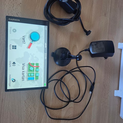 Garmin Camper 780 GPS-navigator med 7 tums färgskärm. Vi kör inte husbil så den används inte längre. Enheten är avsedd för bil och husbil med funktioner för ruttplanering och kartvisning. Menyer och kartor visas på skärmen med tydliga symboler för bland annat destination, kartvy, appar, volym och inställningar.