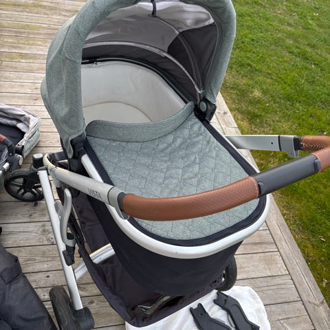 UPPAbaby Cruz sittvagn. Vagnen har justerbart ryggstöd, fempunktssele och avtagbar bygel. Chassit har fyra hjul och en större varukorg under sittdelen. avsedd för vardagsbruk och promenader i stadsmiljö och på jämnare underlag.