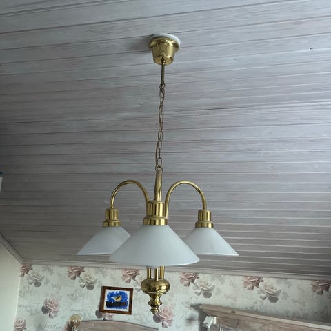 Lampan är i fint fungerande skick. Den har en vacker, naturlig patina på mässingsdetaljerna och textilskärmen.