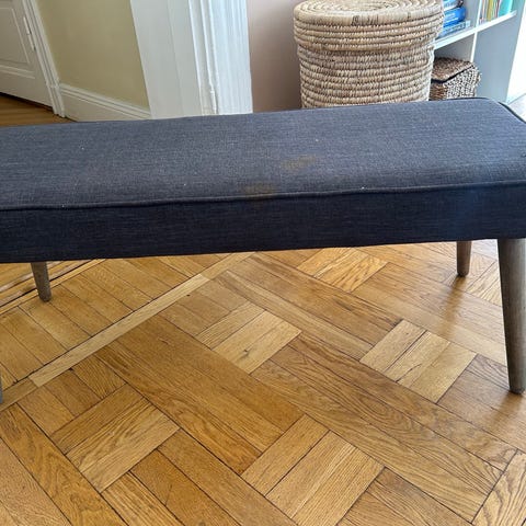Blå mjuk pall. Tror den är från Mio. Passar fint, exempelvis framför sängen. Björkben.