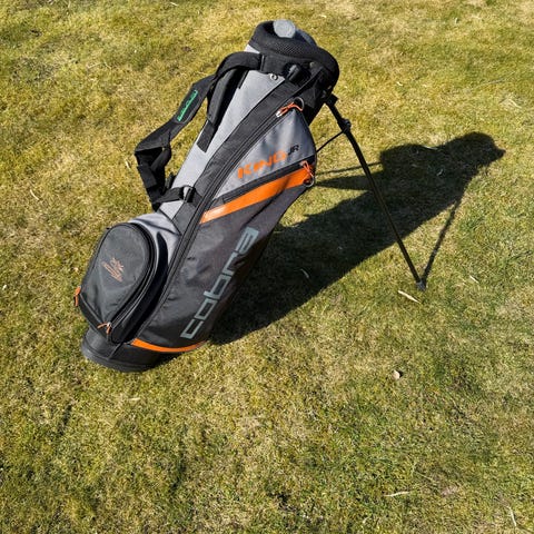 Golfbag/standbag i vit och svart färg. Väskan är utrustad med utfällbara ben för att stå stadigt på marken. Bärremmar finns för att kunna bära väskan på ryggen. Passar för förvaring och transport av golfklubbor och tillbehör på golfbanan.
