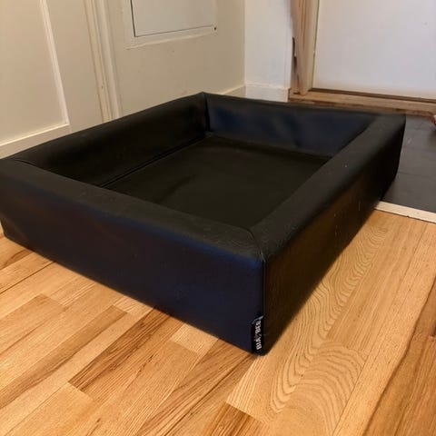 Svart hundbädd i konstläder. Rektangulär modell med upphöjda kanter runtom och lägre liggyta i mitten. Yttermaterialet är slätt konstläder som är enkelt att torka av. Bädden passar för inomhusbruk och kan användas för hund eller annat husdjur. Vissa hörn visar tydligt slitage och skador i materialet, vilket framgår av bilderna. Storleken är 70*60*5cm. Märket är Bia bed.