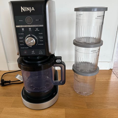 Ninja Creami Deluxe XL glassmaskin i svart utförande. Maskinen är avsedd för att göra glass, sorbet, milkshakes, frozen yoghurt och liknande frysta desserter. På frontpanelen finns flera förinställda program och reglage för olika konsistenser och användningsområden. Medföljande behållare används för att frysa in och sedan bearbeta ingredienserna i maskinen.