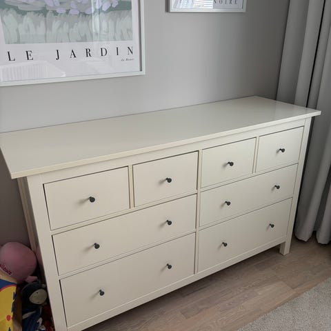 Den har en del synliga skador(se bilder) men är fullt fungerande. Lådorna är hela förutom en front som vi limmat (se bild) men som fungerat felfritt sen dess och fortfarande gör.