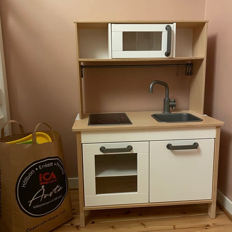 IKEA leksakskök i trä med vit bänkskiva. Köket har två spisplattor, ugn med lucka, diskho med kran samt förvaring bakom dörrar och hyllplan. Passar för barn som vill leka kök och matlagning inomhus. Komplett med tillbehör.