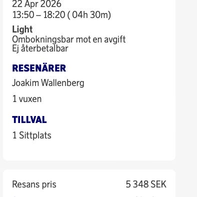 Avgångstid Stockholm-Milano: 14/5 09:50