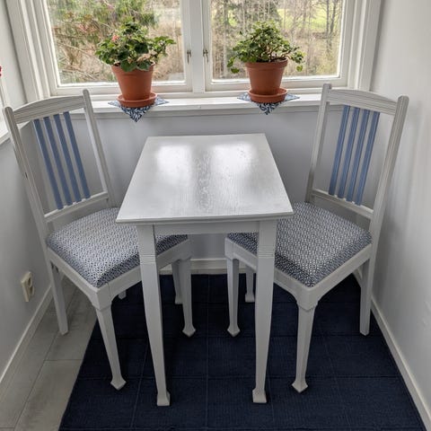 6 svarta stolar. 2 med sittdyna i tyg och 4 med sittdyna i trä.