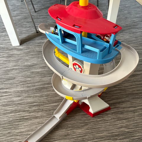 Det stora tornet från Paw Patrol med olika fordon. Tornet har ljud. Mindre märken på parkeringsplatserna (se separat bild).