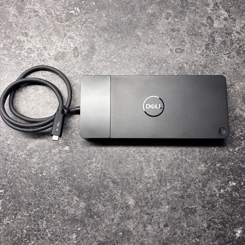Dell dockningsstation i svart färg. Enheten ansluts till dator via kabel och har flera portar på sidorna för anslutning av exempelvis skärm, tangentbord, mus och andra USB-tillbehör. Passar som extra anslutningshub till stationär arbetsplats eller hemmakontor där flera enheter behöver kopplas till en dator via en och samma dockningsstation.