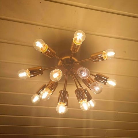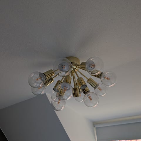 Taklampa Sunshine från By Rydéns formgiven av Anders Eriksson. Lampan har totalt 14 ljuskällor och är kopparfärgad.