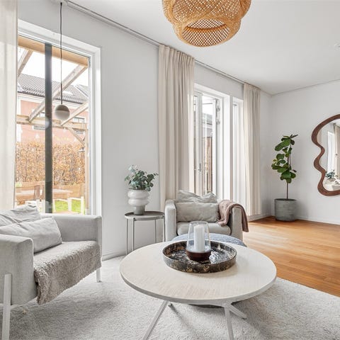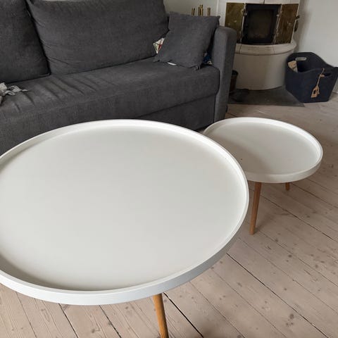 Ett runt soffbord med en diameter på 90 cm i vit färg. Bordet har en enkel och funktionell design med ett rundat bordsskiva och metallben.