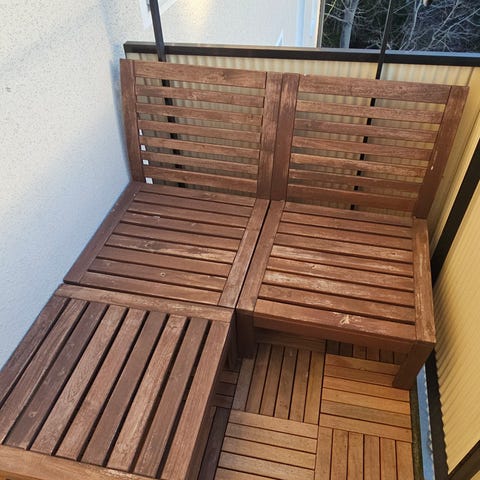 Hörnbänk för utebruk i impregnerad furu från vidaXL utan dynor. Består av tre separata moduler. Passar på altan, balkong eller uteplats. Har stått under tak på balkong och är i god skick.
