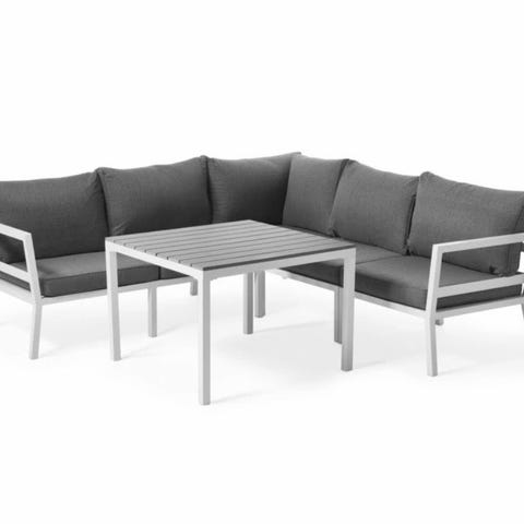 Loungegrupp från Jysk med en tresitssoffa, två fåtöljer och ett rektangulärt bord. Stomme i metall med olivfärgade lackering och lösa grå dynor på sits och rygg. Bordsskiva med keramikplattor.Passar för uteplats, altan eller trädgård som sittgrupp för flera personer.