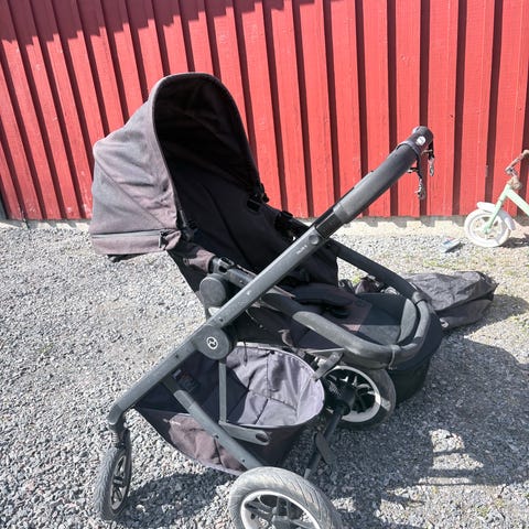 Cybex barnvagn roseguld/svart med separat liggdel och sittdel i svart tyg. Vagnen har ett chassi med fyra hjul och varukorg undertill. Sittdelen är vändbar med justerbart ryggstöd. Liggdel i matchande svart tyg ingår. Liggdel minimalt använd.
