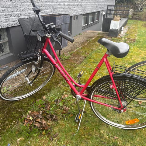 Säljer en röd 3-vxl damcykel med fotbroms. Lite använd. Förvarats flera år innomhus i cykelrum. Använd men bra skick. Punka på bakdäck.