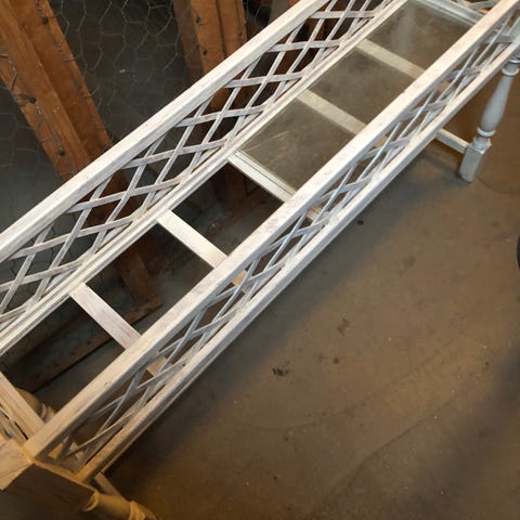 Blombord med spaljé, 1940/50-tal bambu/rotting skivor av glas. Hjultrissor.