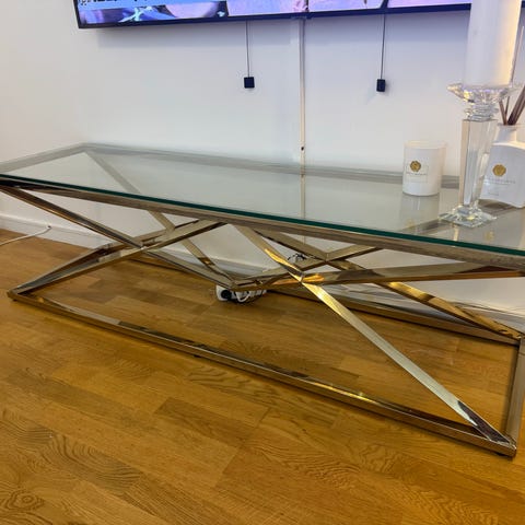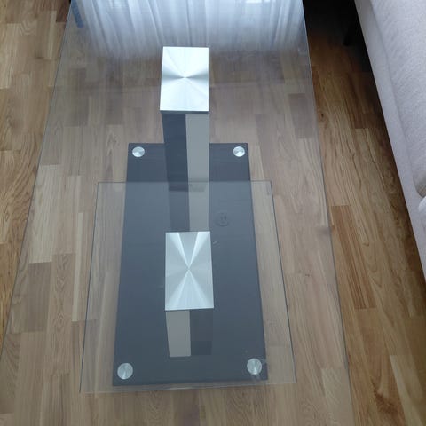 ●Säljer glas soffbord som trieste är ett elegant soffbord med annorlunda och intressant design. Bordsskiva i transparent och härdad glas med underrede i krom