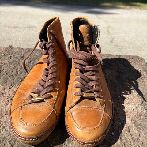 Ett par bruna mockaskor med snörning. Skorna har en vit sula. Använt skick.