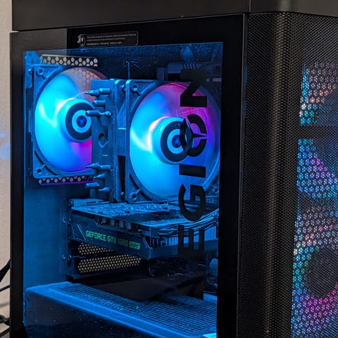 MSI stationär dator med MSI GeForce RTX-grafikkort och chassi med sidopanel i glas. Datorn har flera RGB-fläktar och RGB-belysning på insidan.