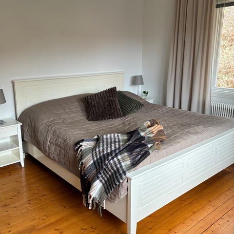 IKEA sänggavel i vit färg. Klassisk träram med hög huvudgavel och lägre fotgavel i panelstil. Passar som dubbelsäng i sovrum.