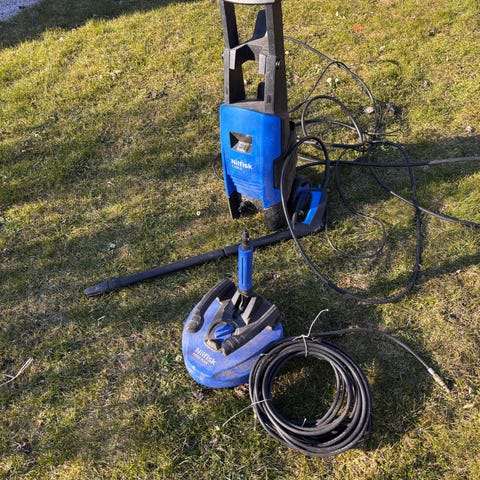 Nilfisk högtryckstvätt i blå färg med integrerad slangvinda. Maskinen är utrustad med högtrycksslang som är upprullad på vinda samt handtag för enkel förflyttning. På bilden syns även ett tillbehör för rengöring av plana ytor, exempelvis altan eller uppfart. Lämplig för rengöring av fordon, uteplatser och andra ytor som tål högtryckstvätt.