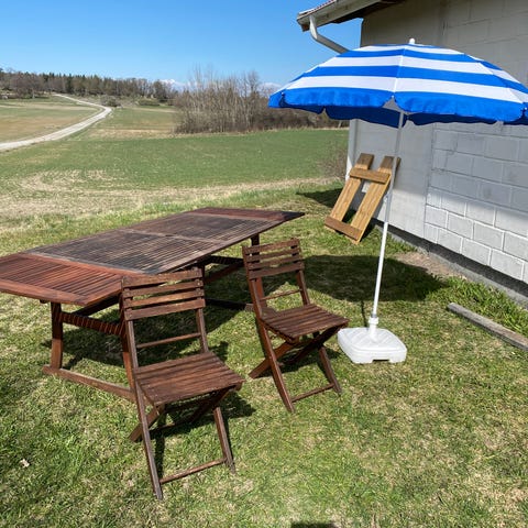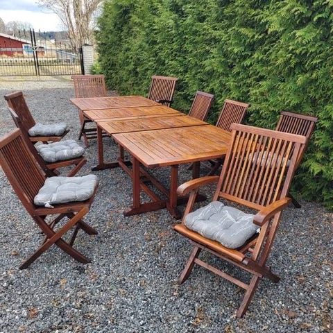 Teak möbler bord 160 cm i diameter 74 cm högt 8 vikbara stolar plus dynor bättre pris vid snabb affär