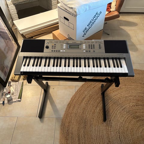 Yamaha digitalpiano i grå färg. Pianot har fullstort klaviatur med vita och svarta tangenter samt inbyggd display och kontrollpanel ovanför tangenterna. Notställ finns monterat på ovansidan. Passar för hemmabruk, övning och musikskapande med olika ljud och inställningar beroende på modellens funktioner.
