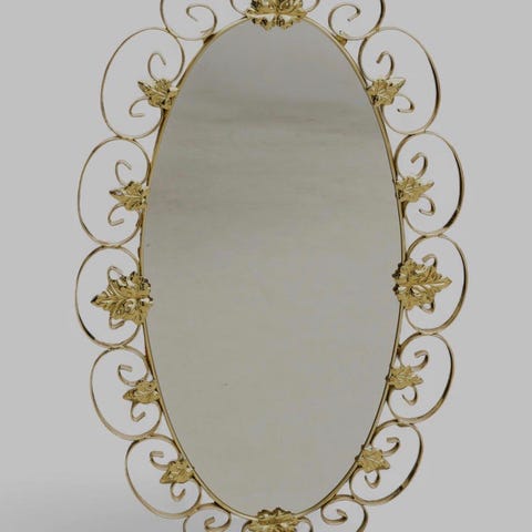 Spegel i oval form med måtten cirka 44 x 53 cm. Spegeln har en svart ram med dekorativa ornament i barockstil längs kanterna. Passar till exempel i hall, sovrum eller vardagsrum som väggspegel eller som del av en tavelvägg. Ramen är tillverkad i ett hårt material med reliefmönster och spegelytan är slät och klar. Är spraymålad och behöver ev lite ny färg.
