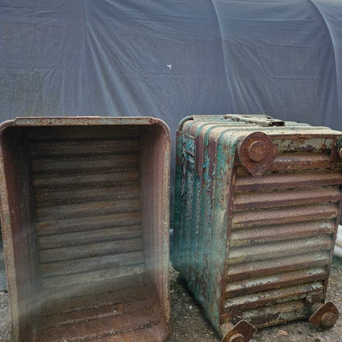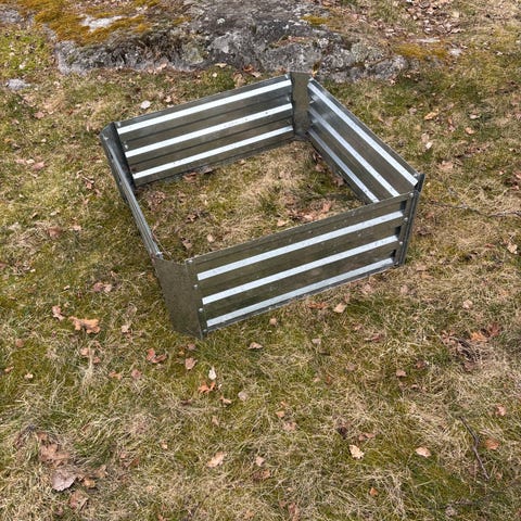 Metallåda Zink med perforerade sidor och botten i grått utförande. Rektangulär form med handtag och etikettfäste på kortsidan. Lämplig för förvaring eller organisering i till exempel garage, verkstad eller förråd.