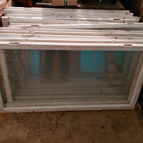 Flertalet fönsterluckor i olika storlekar. Alla är vita och lite slitna av väder och vind.