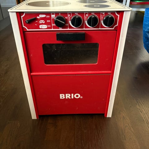BRIO leksaksspis i vit färg. Spisen är utformad som en klassisk barnspis med vred på framsidan och ugnslucka. Kastruller, stekspadar samt Pippi servis i porslin ingår.