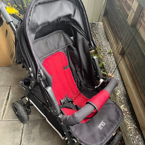 Barnvagn med mycket tillbehör.