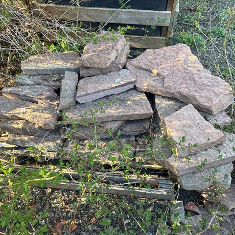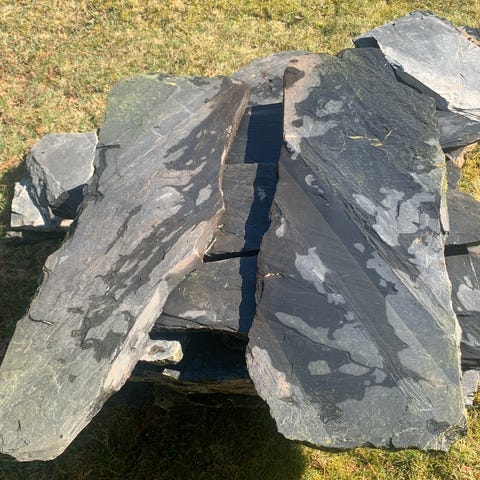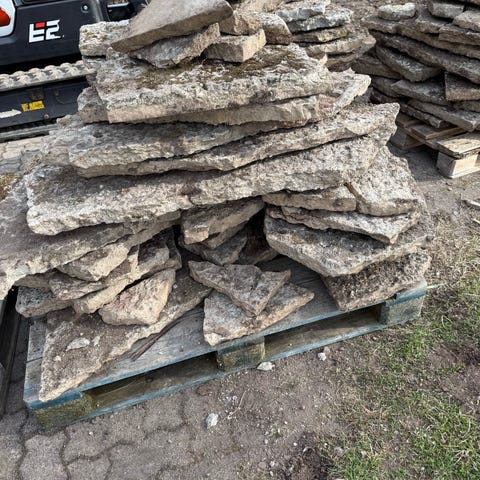 Skiffer stenplattor i natursten i mörkgrå/svart nyans, otvättade. Plattorna är oregelbundna i form och tjocklek och ligger staplade på en pall. Passar för exempelvis gångar, uteplatser, murar eller dekor i trädgård och utomhusmiljöer. Säljs som blandade storlekar i befintligt parti enligt bilder.