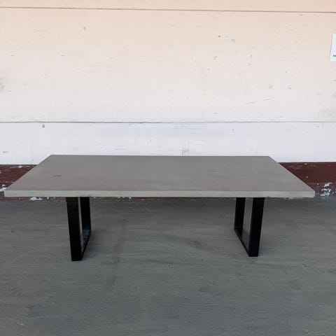 Bänk med betongkaraktär i komposit med underrede i svart stål.