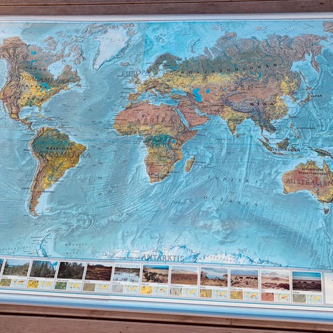 Världskarta som väggkarta. Karta över världens länder och kontinenter med geografiska detaljer som bergskedjor, hav och större vattendrag. Lämplig som väggdekoration eller undervisningsmaterial i hem, skola eller kontor.