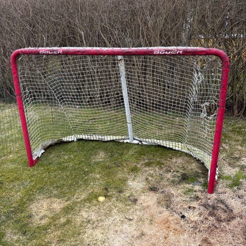 Ishockeymål med nät. Passar för träning och lek på uppfart, gårdsplan eller annan hård yta. Målet har metallram och monterat nät. Storlek och märke är inte angivna. Två hockeyklubbor syns på bilden men ingår ej, mest för att visa storleken på målet