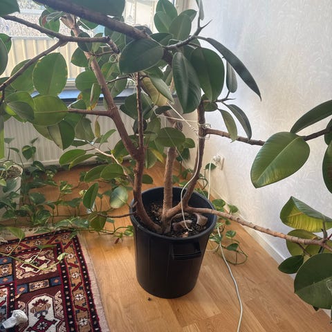 Fönsterfikus (Fikus elastica) krukväxt med mörkgröna, blanka blad. Växten är planterad i en innerkruka i plats och har 3 upprätta stammar. Trivs ljust, gärna i närheten av fönster men utan direkt stark sol under längre perioder.