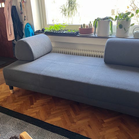 Sparsamt använt divan och bäddsoffa. Beige med silverfärgade ben.