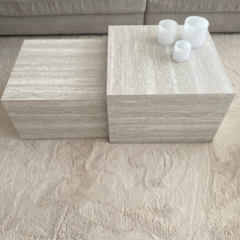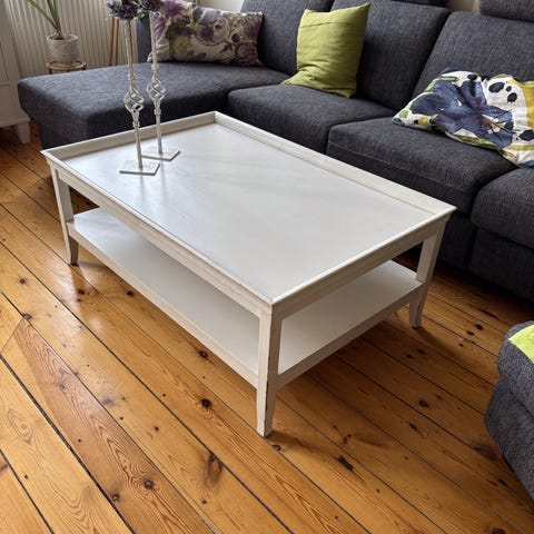 IKEA Havsta soffbord med rektangulär bordsskiva och underhylla för extra förvaring. Mått cirka 100x75 cm enligt ritning på bilden. Bordet är i vit färg och passar som soffbord i vardagsrum eller liknande miljöer.