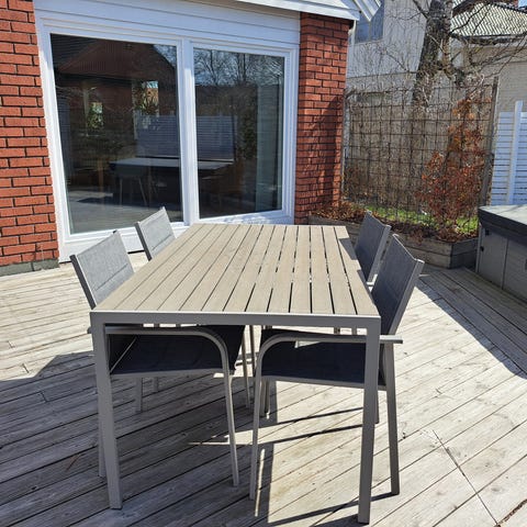 Rymlig matgrupp för uteplats eller uterum. Bordet har en praktisk butterfly-skiva som enkelt förlängs från 200 cm till hela 260 cm – perfekt när du får gäster. Tillverkad i ett tåligt träslag (troligen teak eller mahogny).
