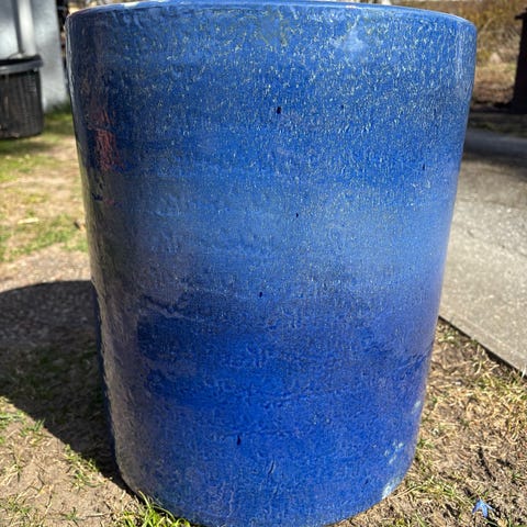 Rund kruka i keramik i grön nyans med brun kant. Vertikala räfflor runt om ger en strukturerad yta.