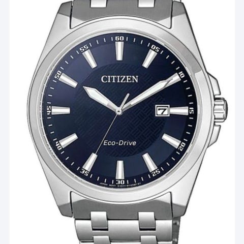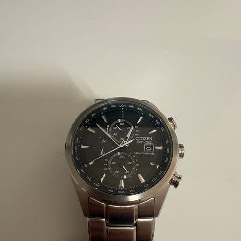 Citizen herrklocka med kronograf och datumvisning. Klockan har svart urtavla med tydliga siffror och lysande visare, samt tre mindre suburtavlor för kronograffunktioner. Boett och länk är i stål med viklås. Bezel med tachymeterskala runt urtavlan.