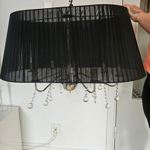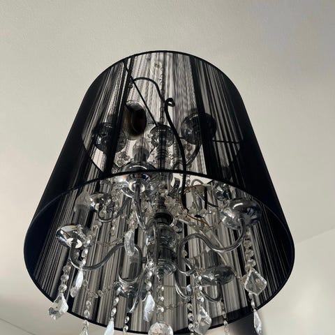 Säljer en elegant taklampa köpt från Chilli. En modern ljuskrona med en halvtransparent svart textilskärm och vackra kristaller.