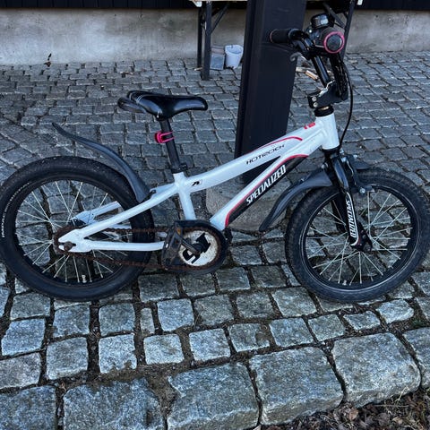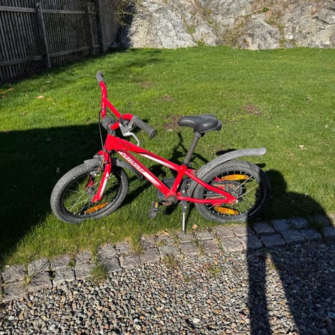 Specialized barncykel med 16" hjul. Cykeln har röd ram, svart sadel och styre samt fotbroms och reflexer på hjulen.