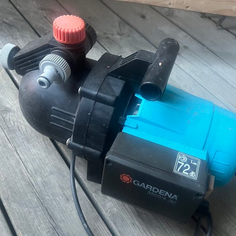 Trädgårdspump från Gardena, modell 3500/4. Vi har aldrig använt pumpen (kartongen är dock lite illa medfaren då pumpen blivit stående i källaren). Hämtas i Sävsjö och betalas med Swish.
