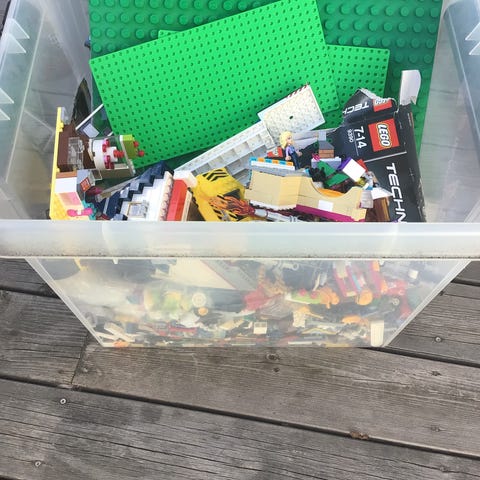 Stor plastlåda i måtten ca 55*35 fylld med Lego.