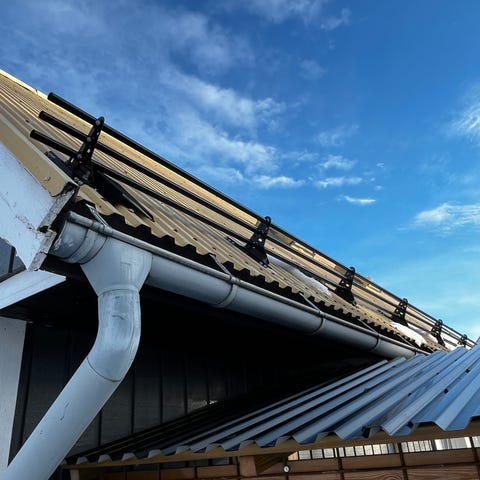 Pannplåtstak ca 57m2. Varje plåt är ca L=1,84 B = 90. Köparen står för nedmontering.